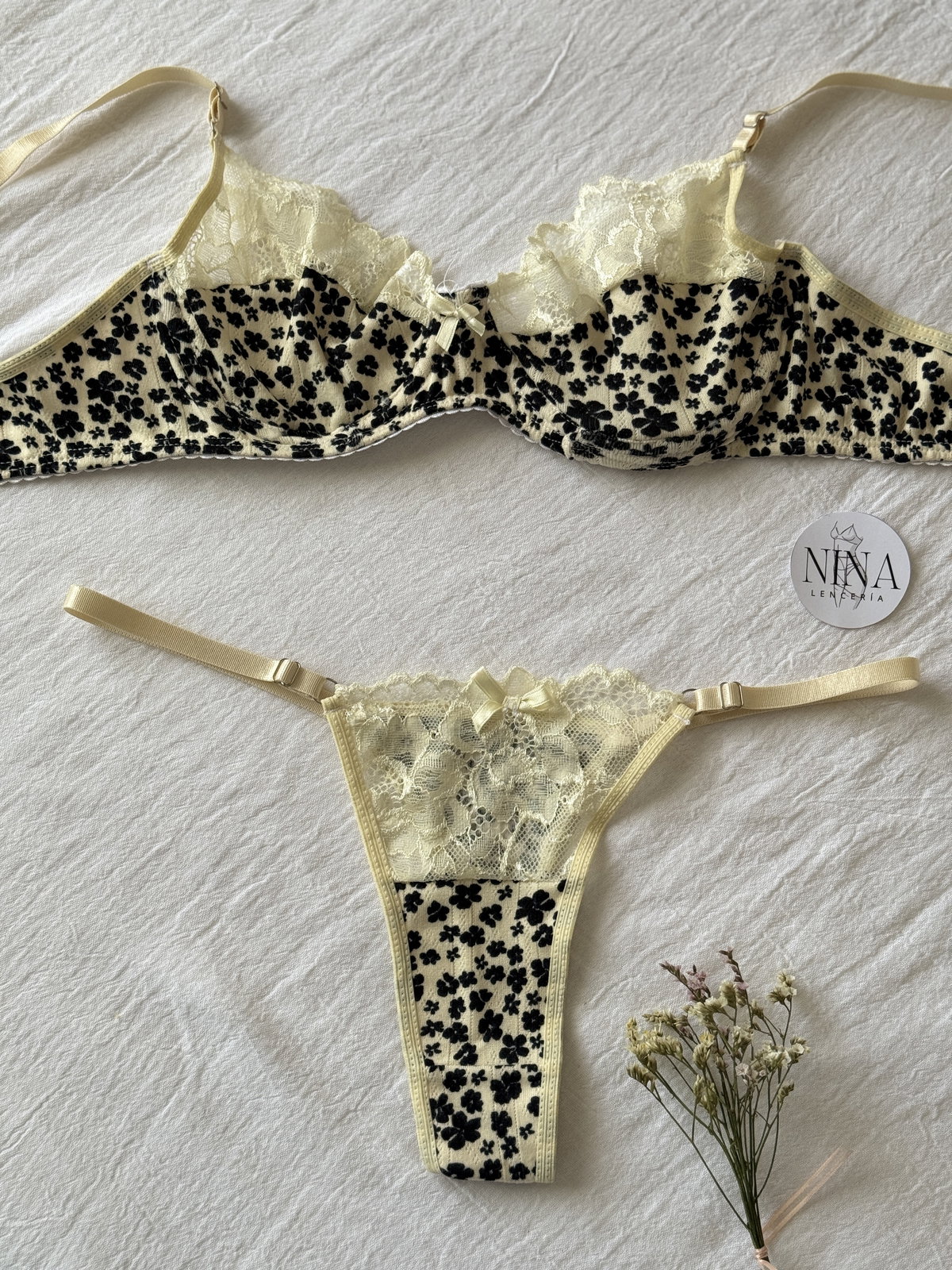 Bralette con aro y bombacha regulable confeccionados en algodón jersey con detalles en puntilla.
