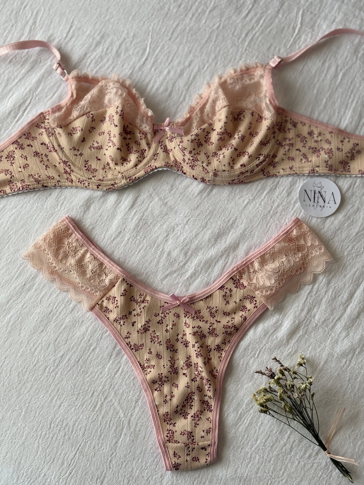 Bralette con aro y bombacha colaless en V, confeccionados en algodón jersey con detalles en puntilla.