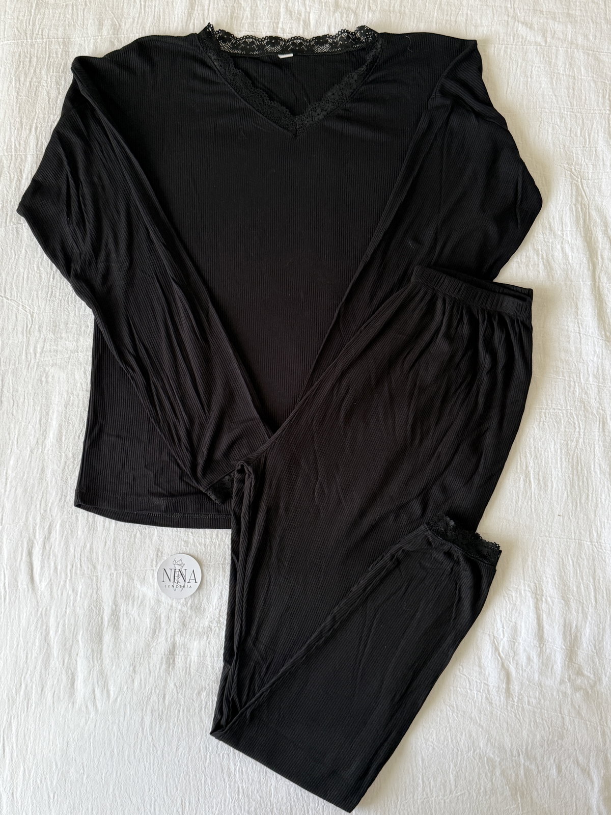 Pijama camiseta manga larga con pantalón confeccionado en morley con terminaciones en puntilla.